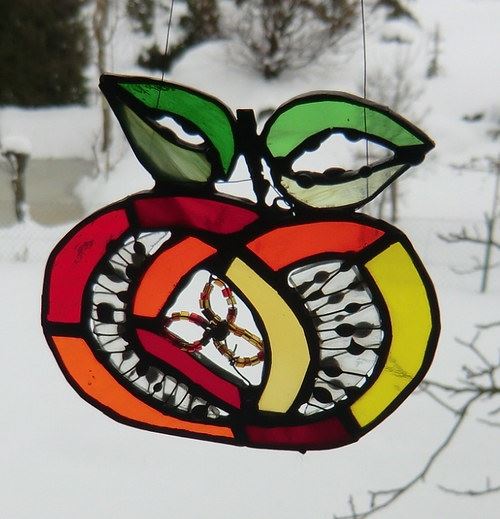 Vitrážka - závěs z katedrálového skla červeného, zeleného a žlutého. Ošetřeno patinou a antioxidantem.