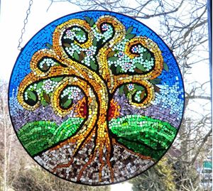 Skleněná mozaika, lepená UV lepidlem, byla zhotovená na objednávku. Pro Vás mohu vytvořit podobnou, vždy se však může trochu lišit, případně můžeme se domluvit na různých detailech. Průměr této vystavené je 40 cm.